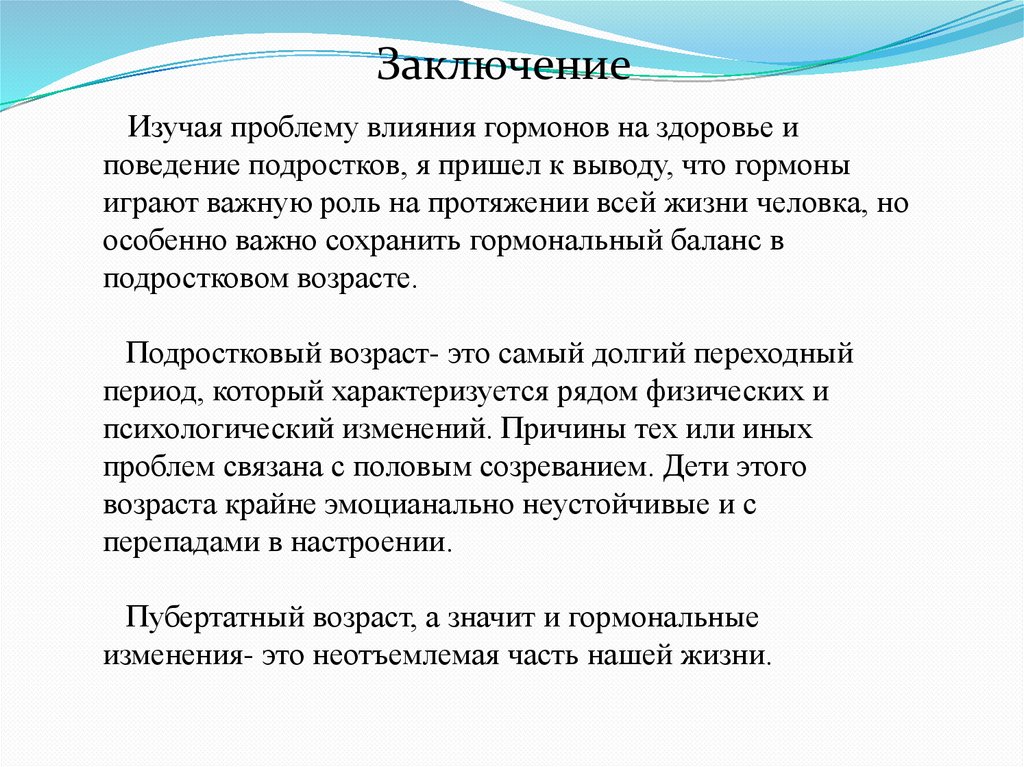 ЗаключениеИзучая проблему влияния гормонов на здоровье и
