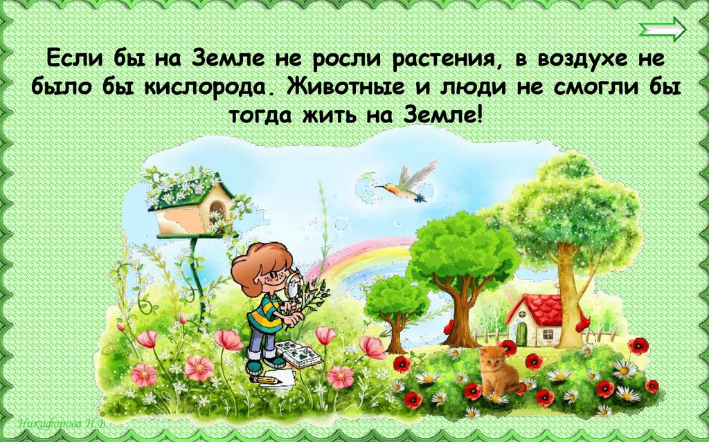 Если бы на Земле не росли растения, в воздухе небыло бы кислорода. Животные и люди не смогли бы