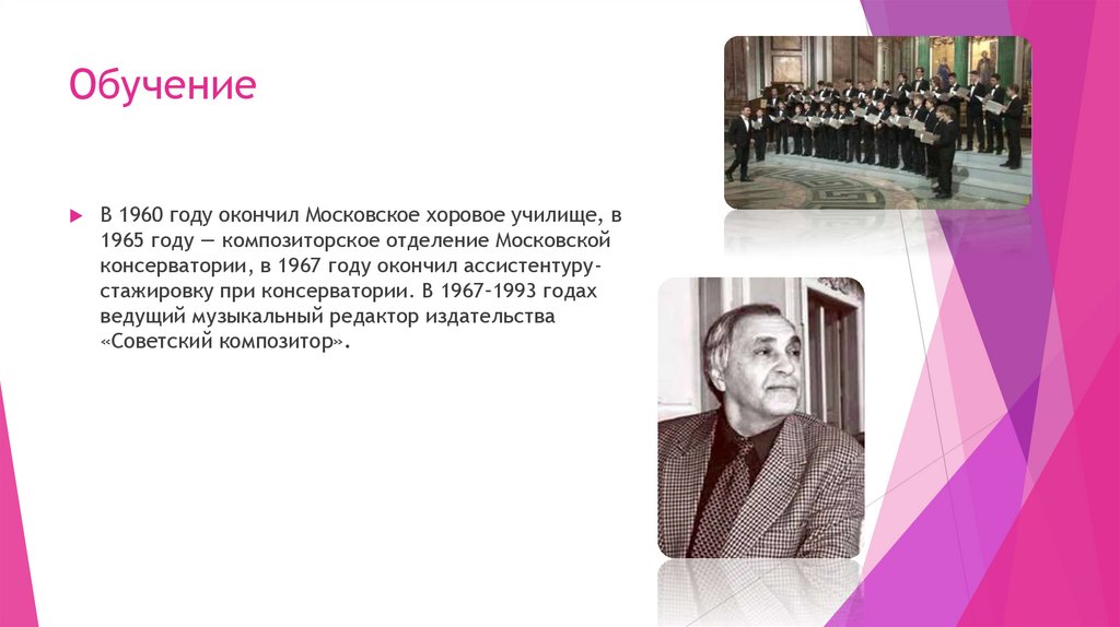 ОбучениеВ 1960 году окончил Московское хоровое училище, в