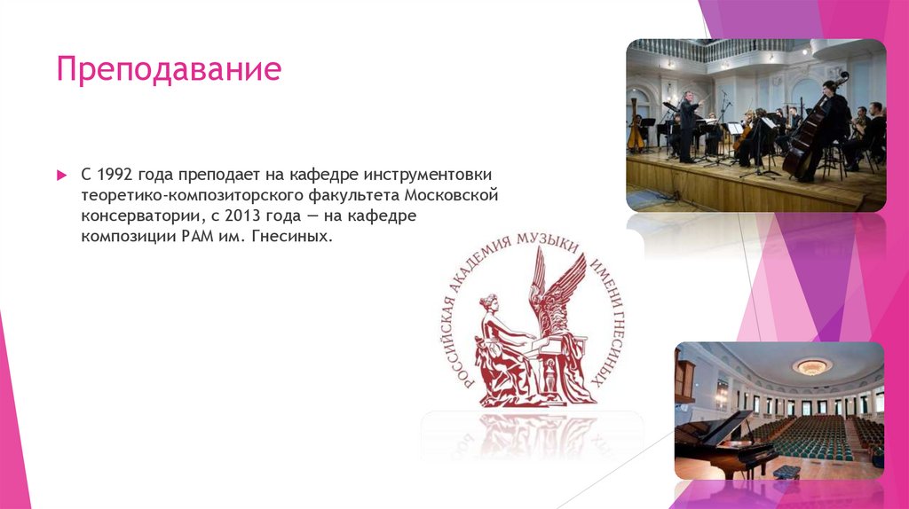 ПреподаваниеС 1992 года преподает на кафедре инструментовки