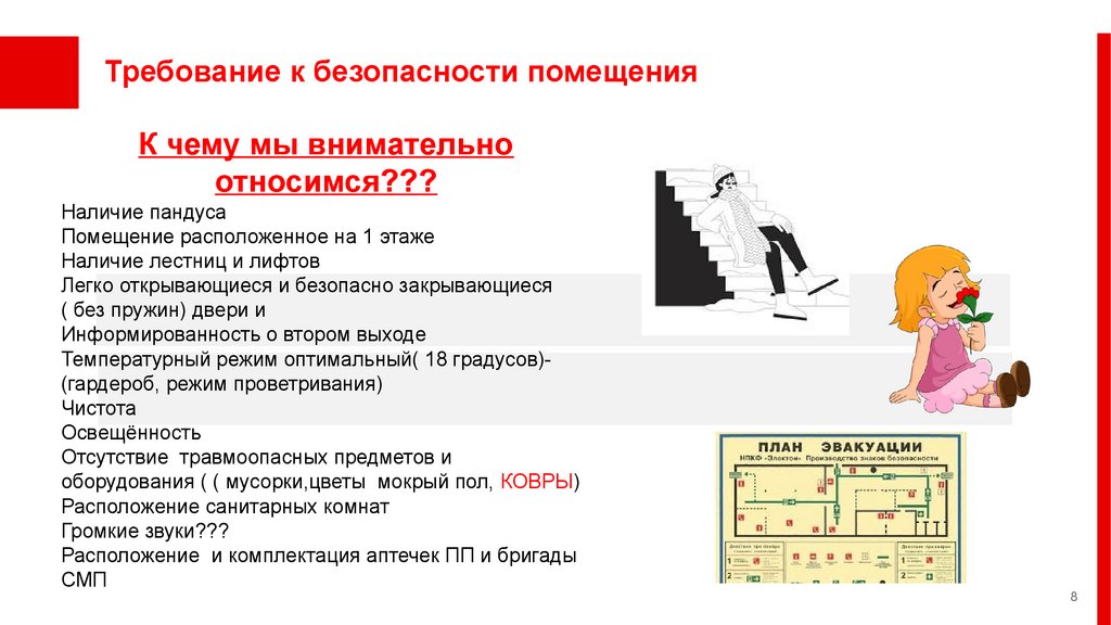 наличие указателей, громкие звуки, дизайн ( ковры, цветы), расположение