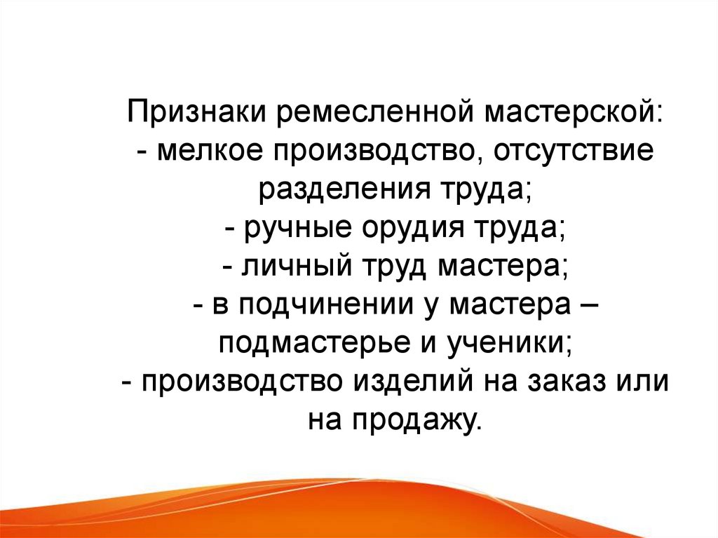 Признаки ремесленной мастерской:- мелкое производство, отсутствие