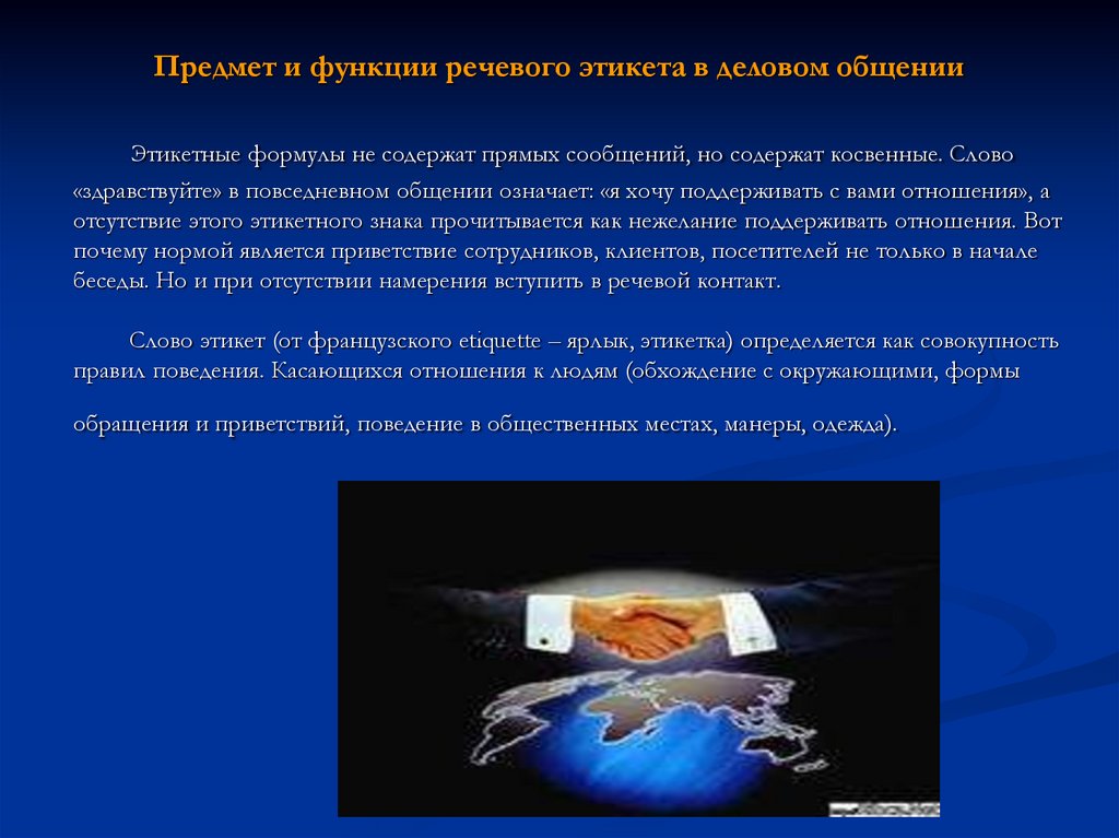 Этикетные формулы не содержат прямых сообщений, но содержат косвенные. Слово«здравствуйте» в повседневном общении означает: «я хочу поддерживать с вами отношения», а