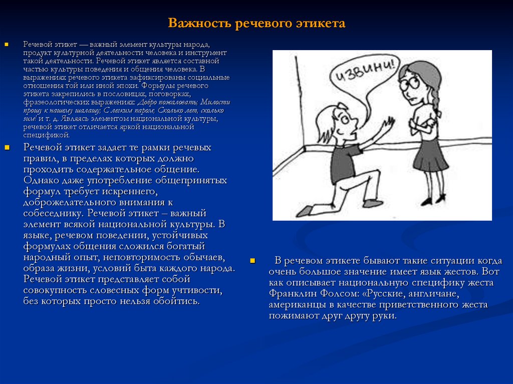 Речевой этикет — важный элемент культуры народа,продукт культурной деятельности человека и инструмент