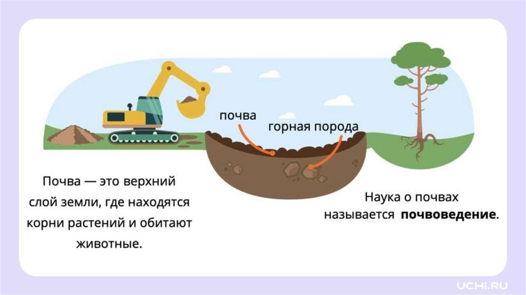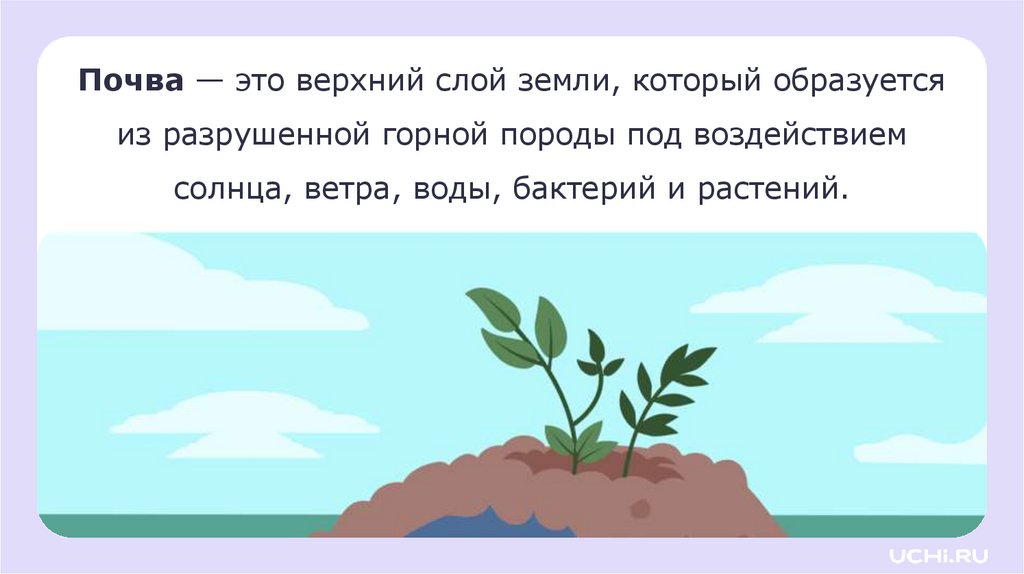Почва — это верхний слой земли, который образуетсяиз разрушенной горной породы под воздействием