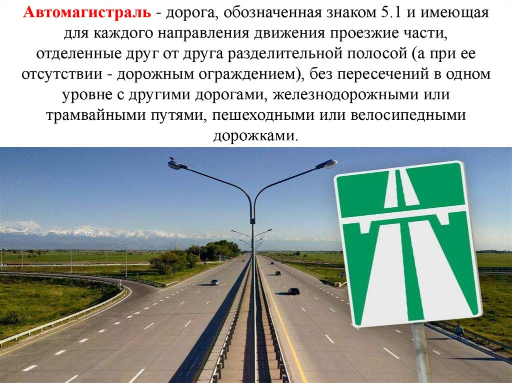 Автомагистраль - дорога, обозначенная знаком 5.1 и имеющаядля каждого направления движения проезжие части,