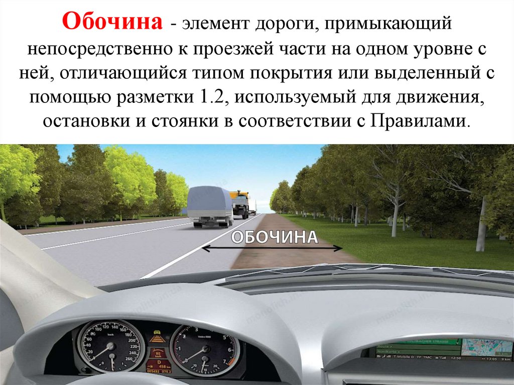 Обочина - элемент дороги, примыкающийнепосредственно к проезжей части на одном уровне с