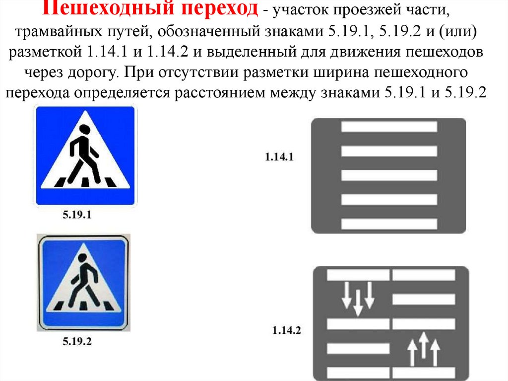 Пешеходный переход - участок проезжей части,трамвайных путей, обозначенный знаками 5.19.1, 5.19.2 и (или)