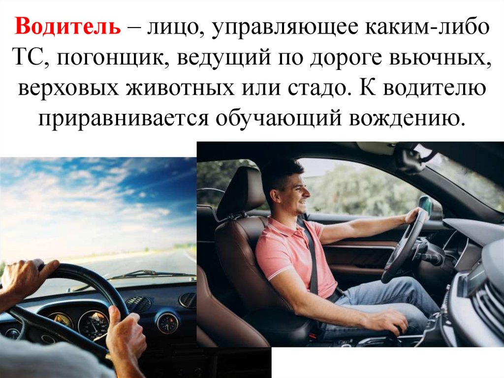 Водитель – лицо, управляющее каким-либоТС, погонщик, ведущий по дороге вьючных,
