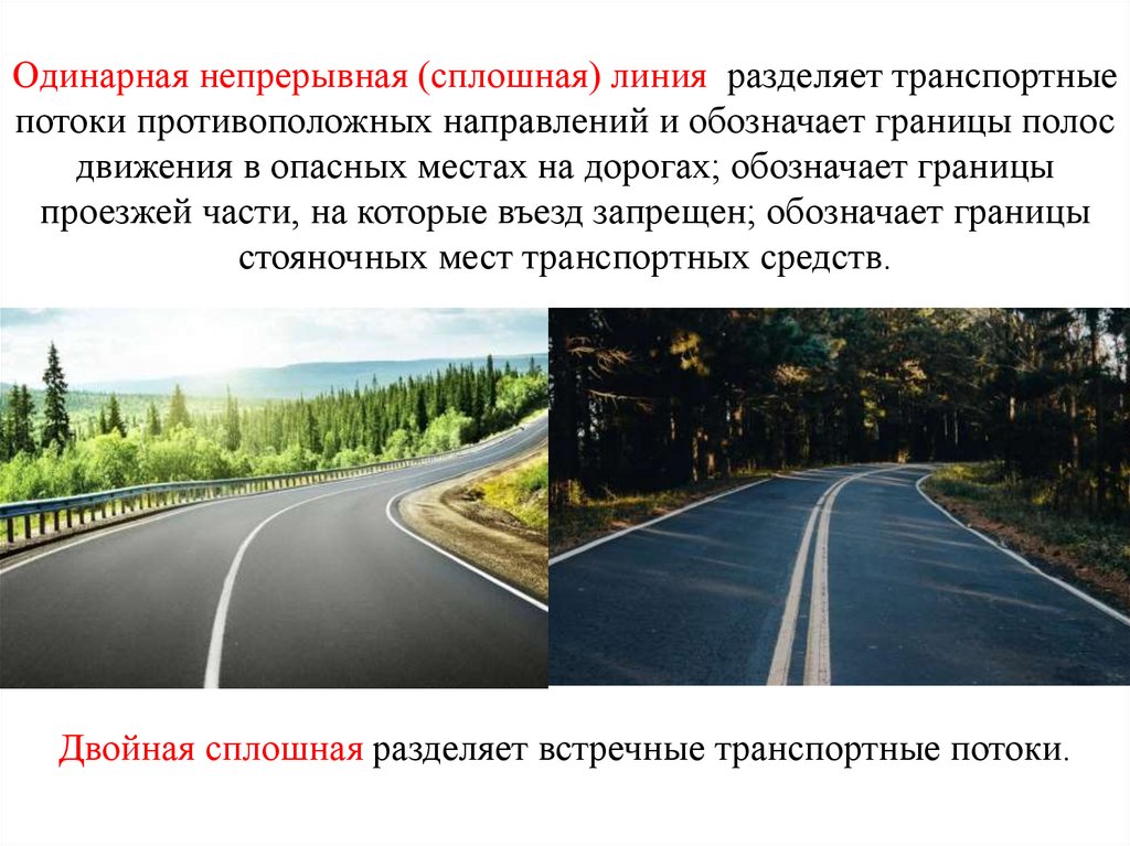 Одинарная непрерывная (сплошная) линия разделяет транспортныепотоки противоположных направлений и обозначает границы полос