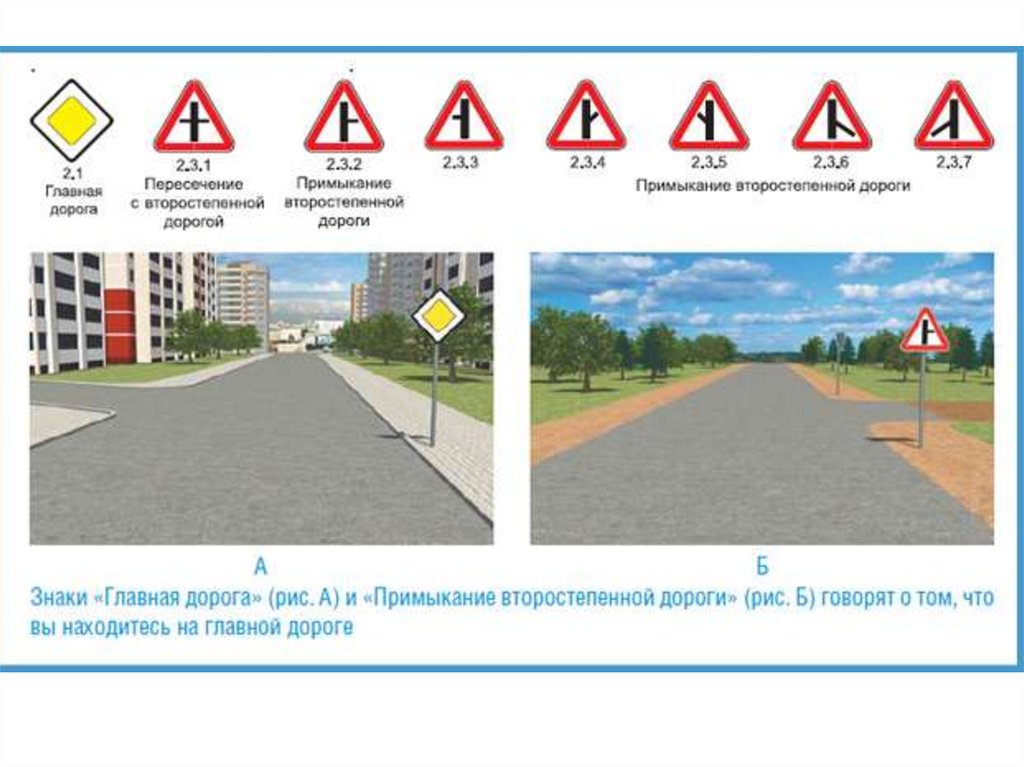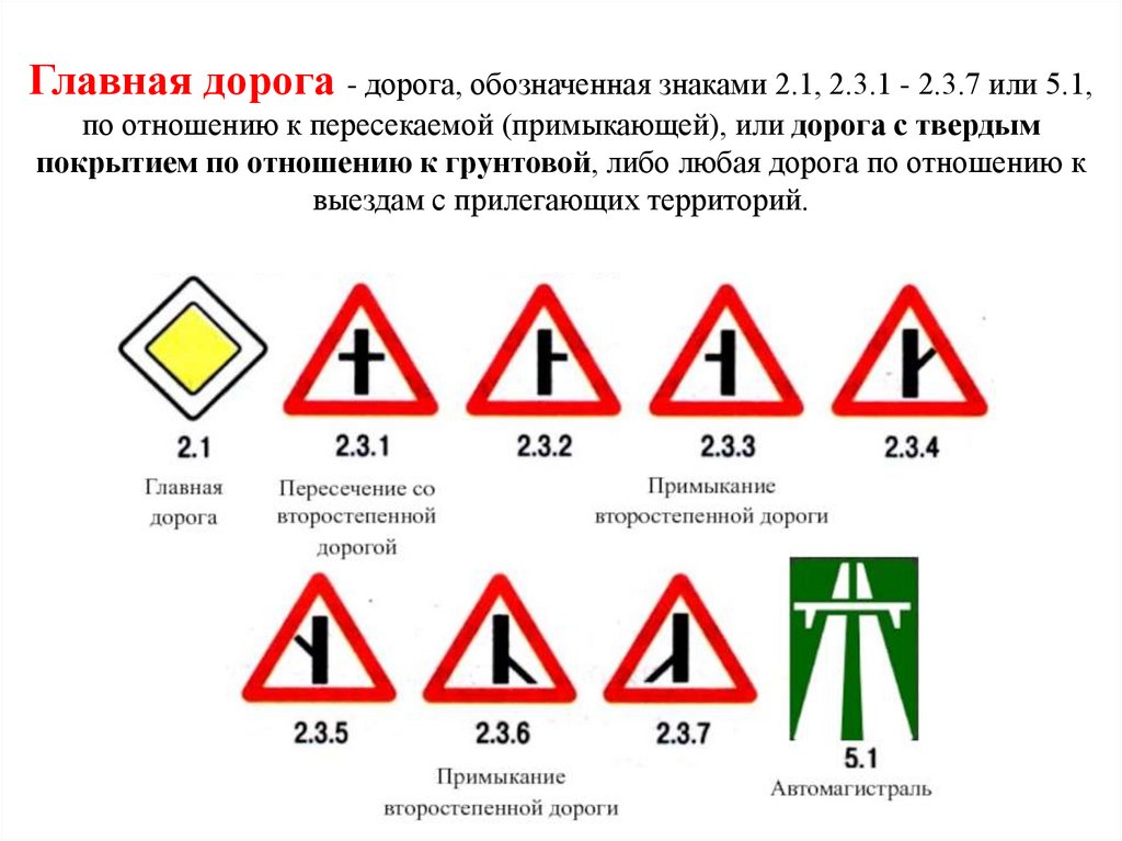 Главная дорога - дорога, обозначенная знаками 2.1, 2.3.1 - 2.3.7 или 5.1,по отношению к пересекаемой (примыкающей), или дорога с твердым