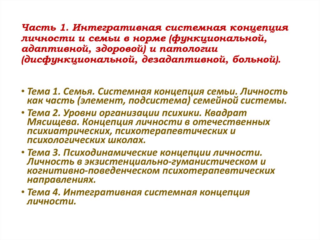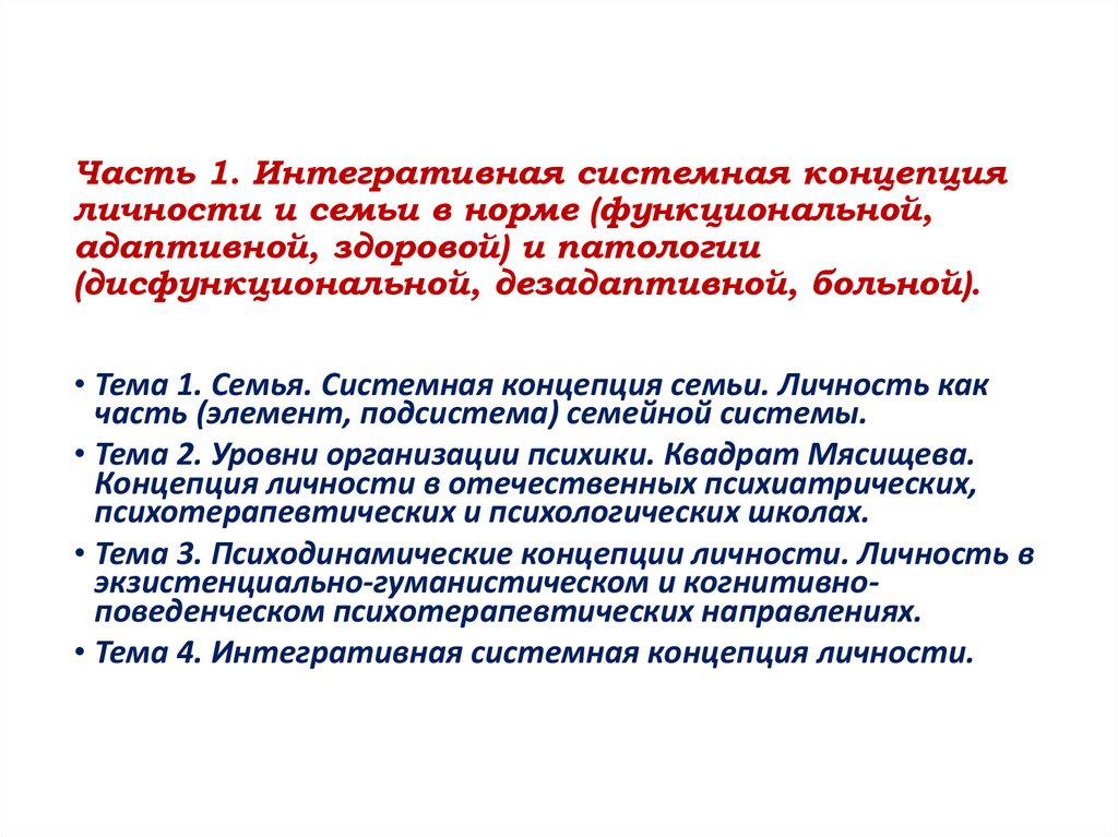 Часть 1. Интегративная системная концепция личности исемьи в норме (функциональной, адаптивной, здоровой) и