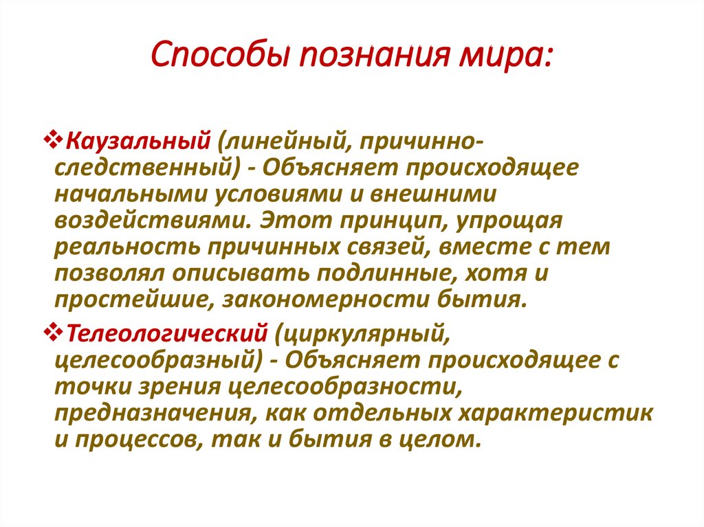 Способы познания мира:Каузальный (линейный, причинноследственный) - Объясняет происходящее