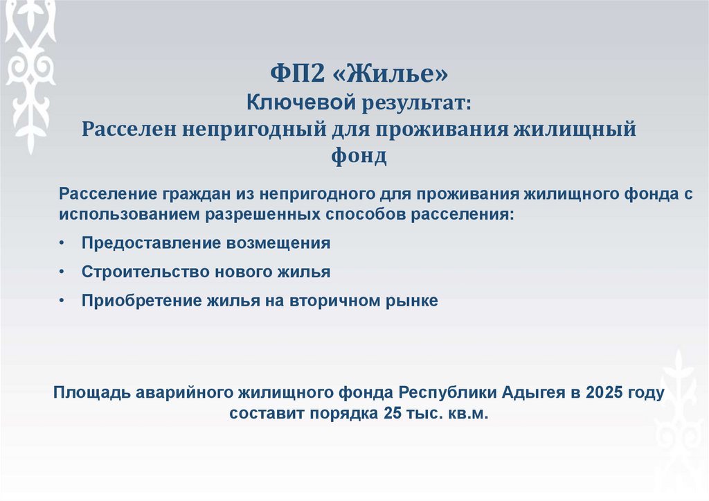 ФП2 «Жилье» Ключевой результат: Расселен непригодный для проживания жилищный фонд