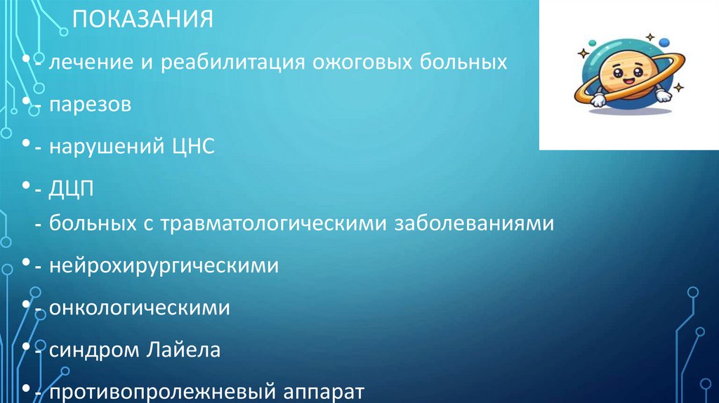 ПОКАЗАНИЯ• - лечение и реабилитация ожоговых больных