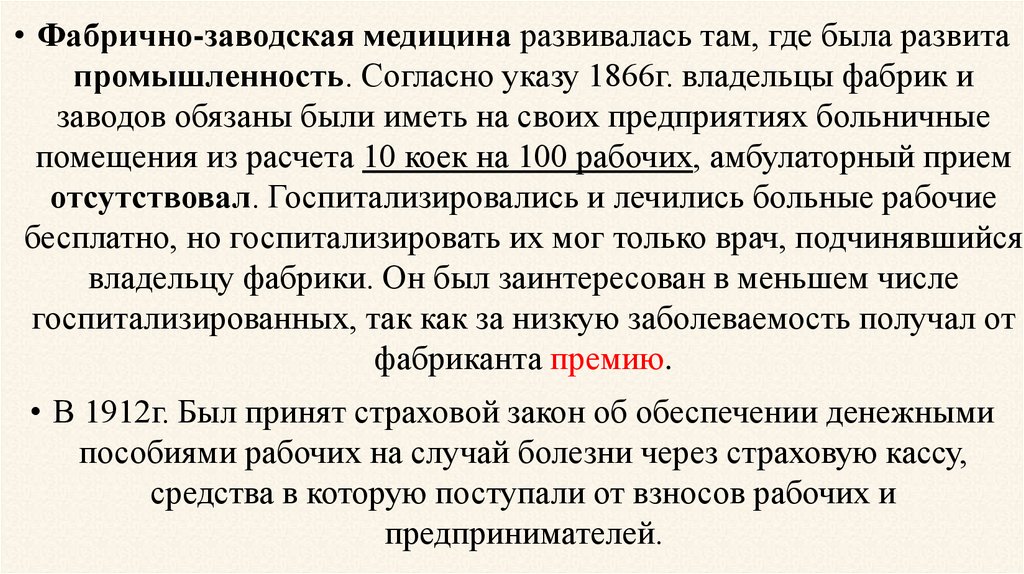 • Фабрично-заводская медицина развивалась там, где была развитапромышленность. Согласно указу 1866г. владельцы фабрик и