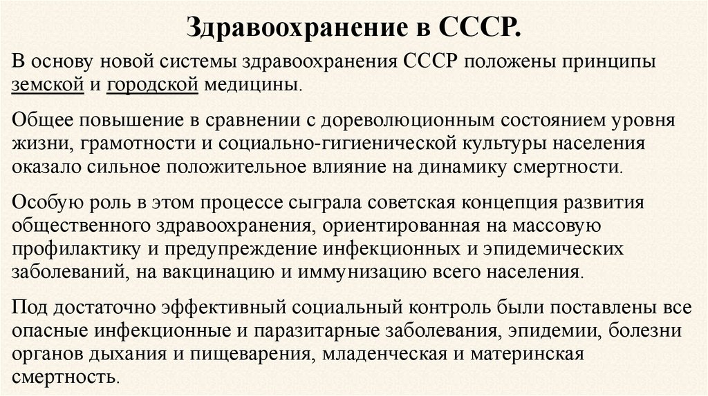 Здравоохранение в СССР.В основу новой системы здравоохранения СССР положены принципы