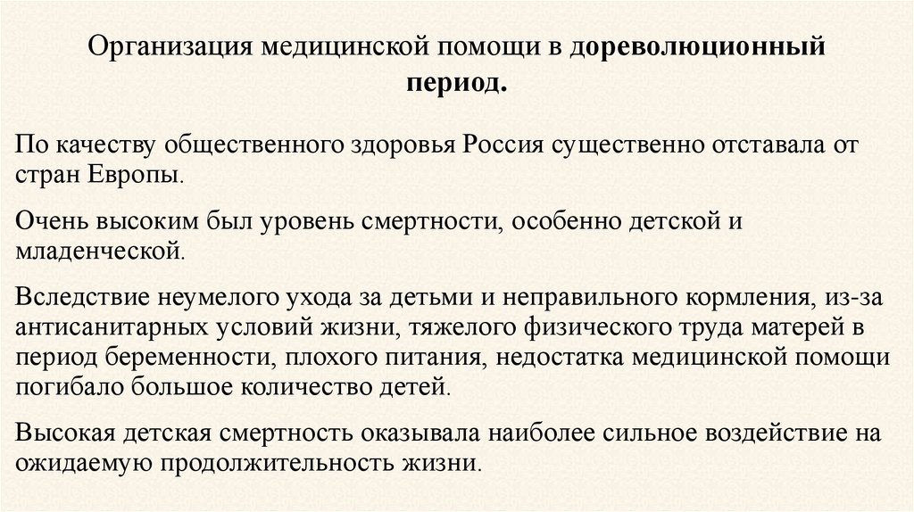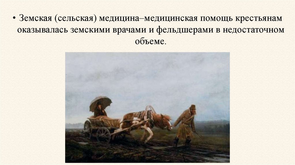 • Земская (сельская) медицина–медицинская помощь крестьянамоказывалась земскими врачами и фельдшерами в недостаточном
