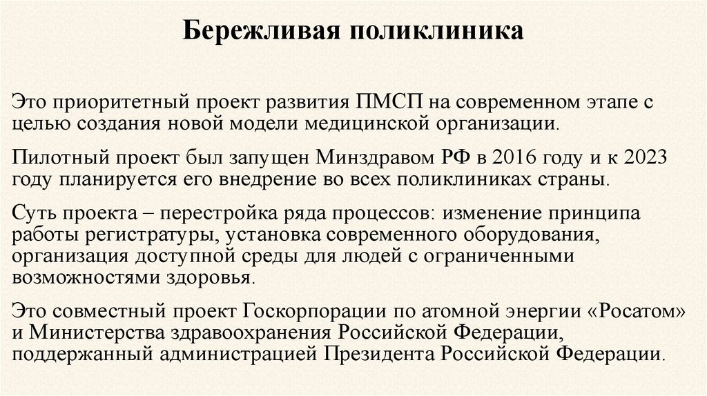 Бережливая поликлиникаЭто приоритетный проект развития ПМСП на современном этапе с