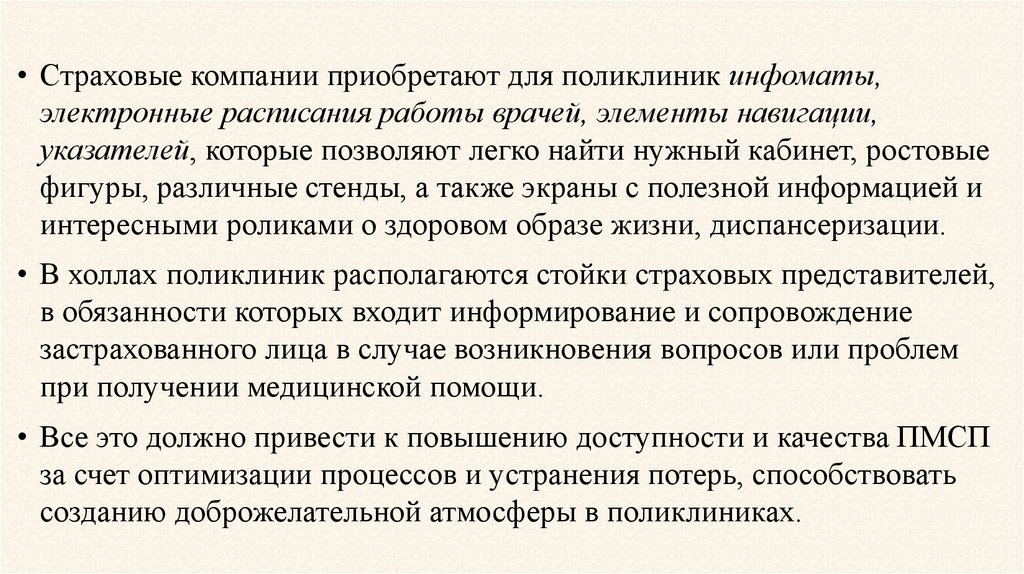 • Страховые компании приобретают для поликлиник инфоматы,электронные расписания работы врачей, элементы навигации,