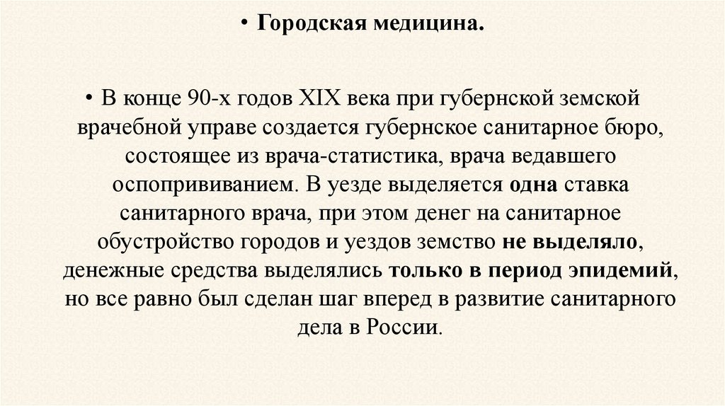 • Городская медицина.• В конце 90-х годов XIX века при губернской земской