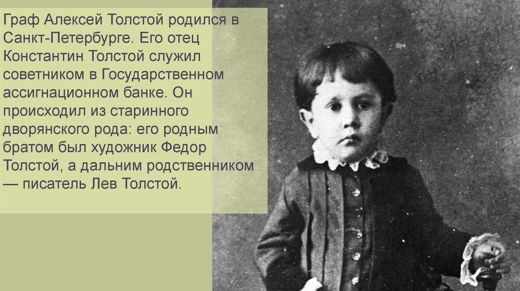 Граф Алексей Толстой родился вСанкт-Петербурге. Его отец