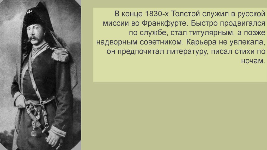 В конце 1830-х Толстой служил в русскоймиссии во Франкфурте. Быстро продвигался