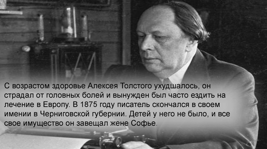 С возрастом здоровье Алексея Толстого ухудшалось, онстрадал от головных болей и вынужден был часто ездить на