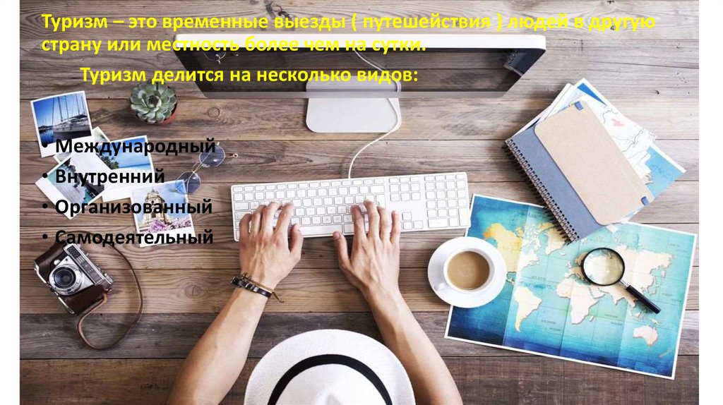 Туризм – это временные выезды ( путешействия ) людей в другуюстрану или местность более чем на сутки.