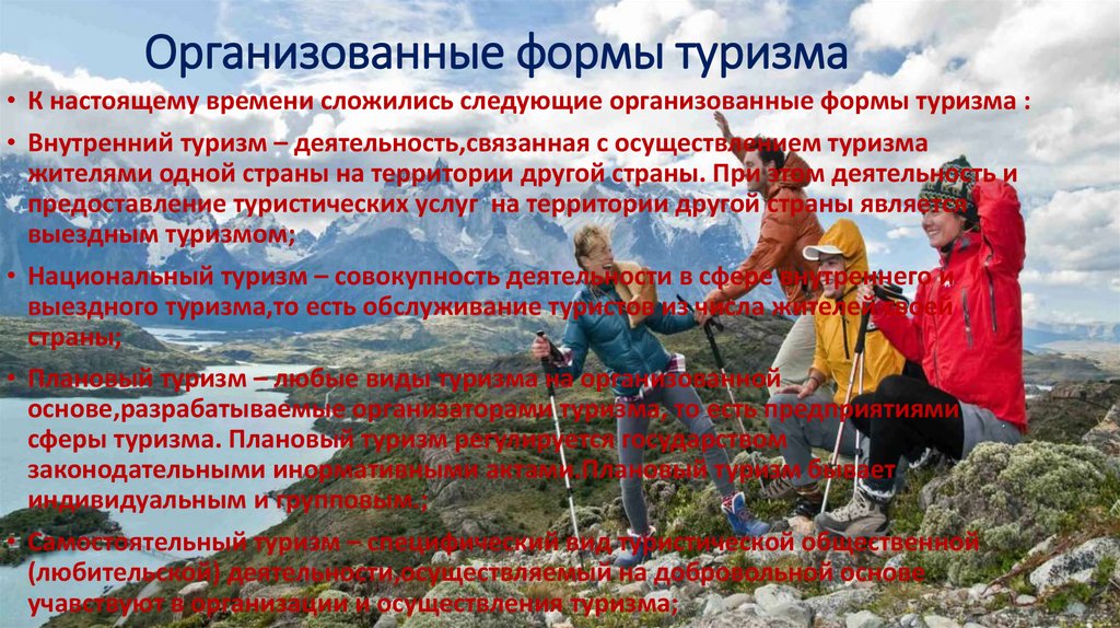 Организованные формы туризма• К настоящему времени сложились следующие организованные формы туризма :