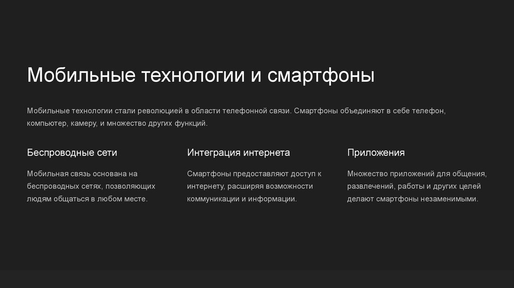 Мобильные технологии и смартфоныМобильные технологии стали революцией в области телефонной связи. Смартфоны объединяют в себе телефон,