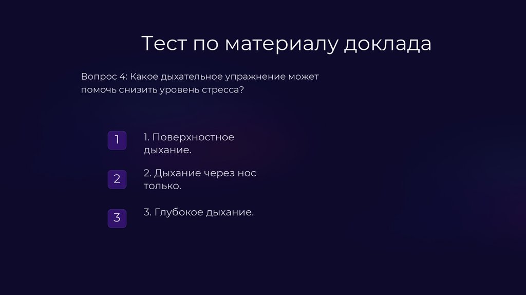 Тест по материалу докладаВопрос 4: Какое дыхательное упражнение может