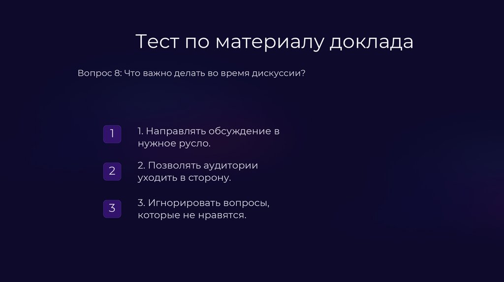 Тест по материалу докладаВопрос 8: Что важно делать во время дискуссии?