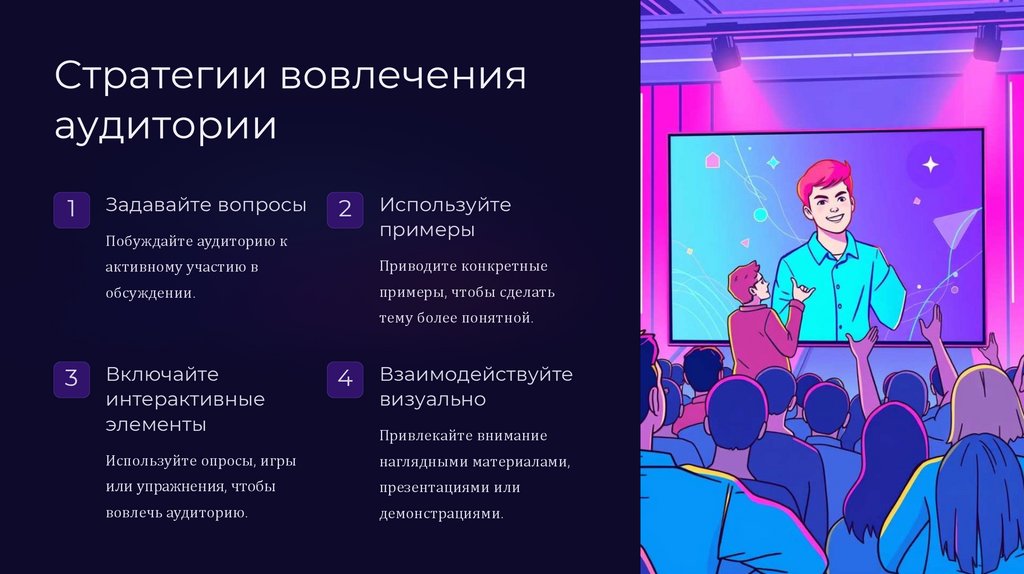 слушателей и установить связь с ними. Взаимодействие с аудиторией ключевой навык, который помогает управлять вниманием, отвечать на