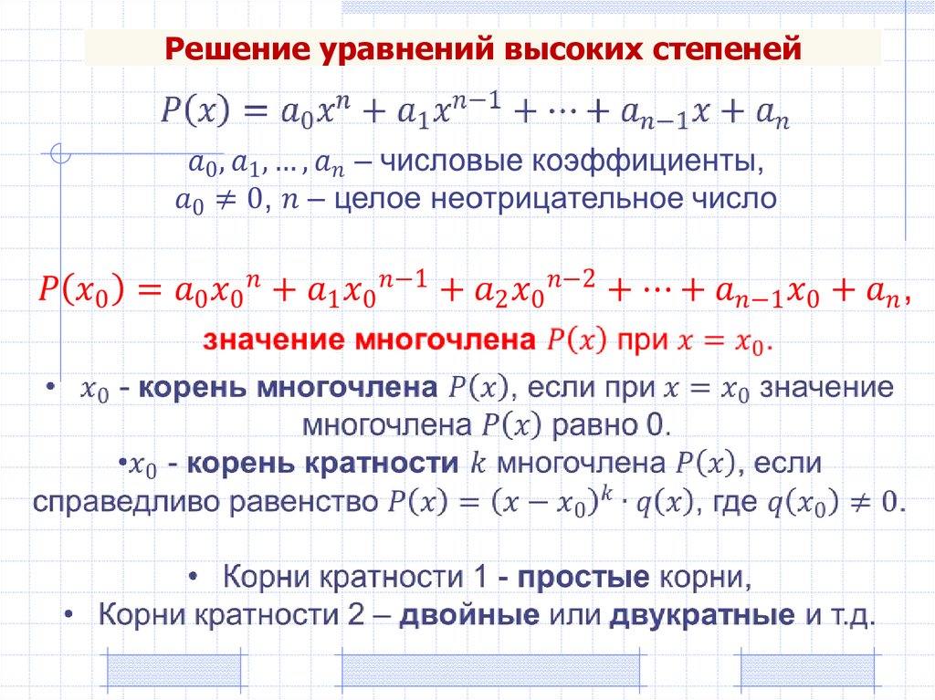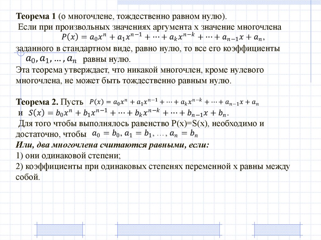 Теорема 1 (о многочлене, тождественно равном нулю).Если при произвольных значениях аргумента х значение многочлена