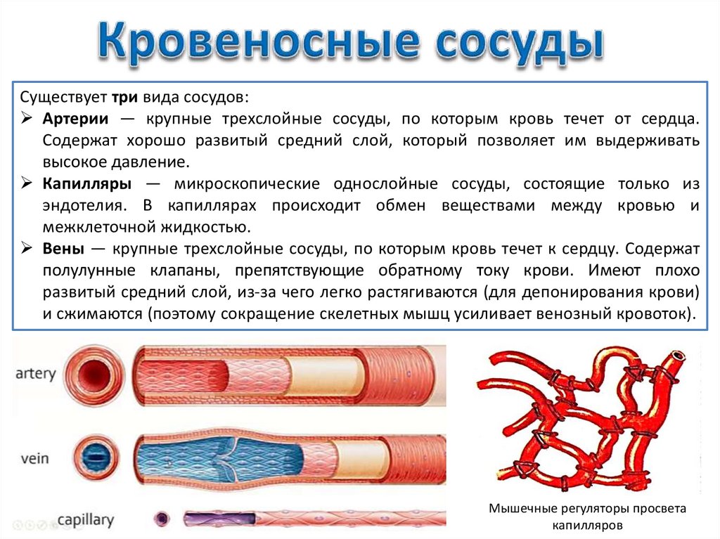 Существует три вида сосудов:Артерии ― крупные трехслойные сосуды, по которым кровь течет от сердца.