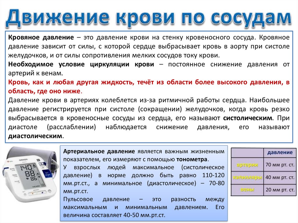 Кровяное давление – это давление крови на стенку кровеносного сосуда. Кровяноедавление зависит от силы, с которой сердце выбрасывает кровь в аорту при систоле