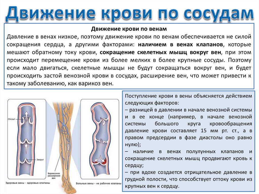 Движение крови по венамДавление в венах низкое, поэтому движение крови по венам обеспечивается не силой