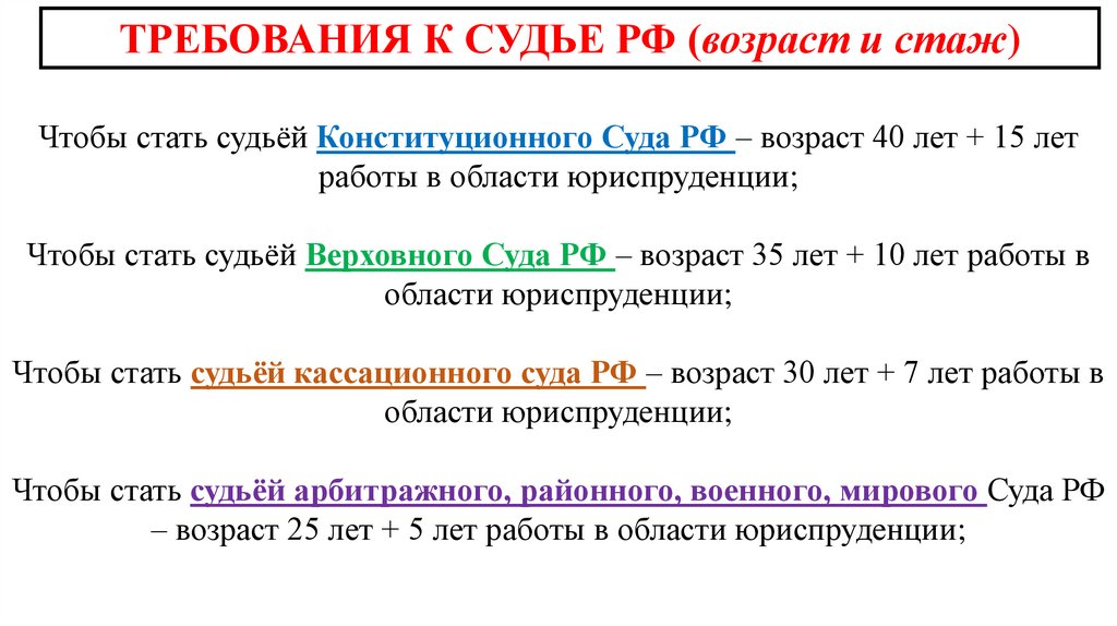 ТРЕБОВАНИЯ К СУДЬЕ РФ (возраст и стаж)Чтобы стать судьёй Конституционного Суда РФ – возраст 40 лет + 15 лет