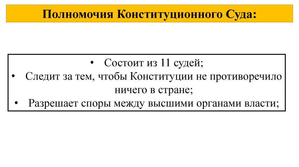 Полномочия Конституционного Суда:• Состоит из 11 судей;