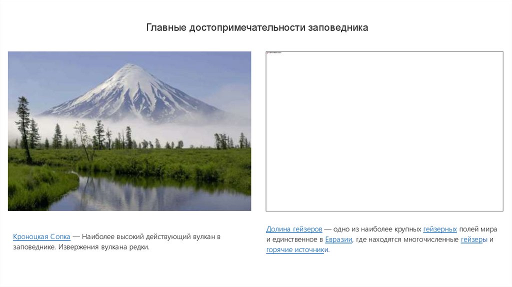 Главные достопримечательности заповедникаКроноцкая Сопка — Наиболее высокий действующий вулкан в