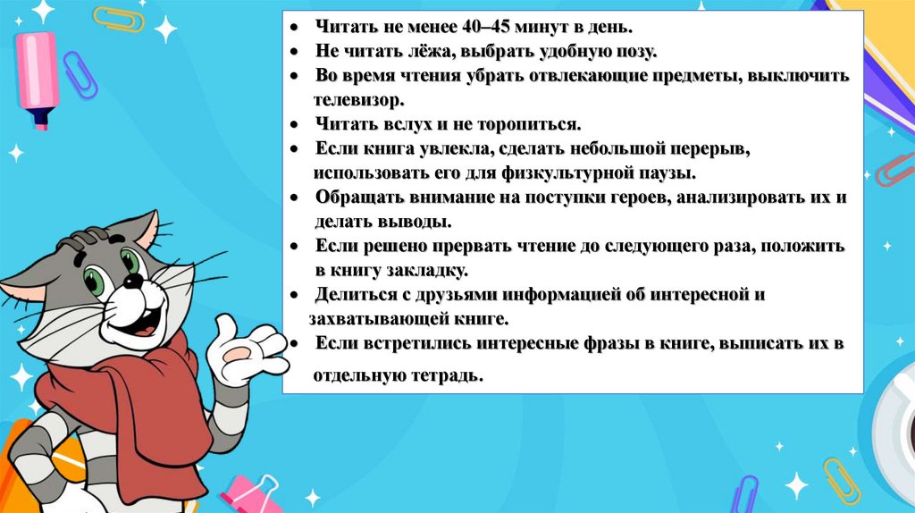 Читать не менее 40–45 минут в день.Не читать лёжа, выбрать удобную позу.