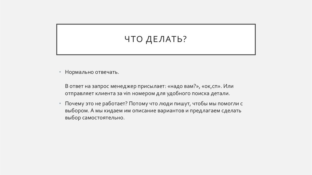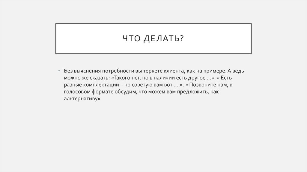 ЧТО ДЕЛАТЬ?• Без выяснения потребности вы теряете клиента, как на примере. А ведь
