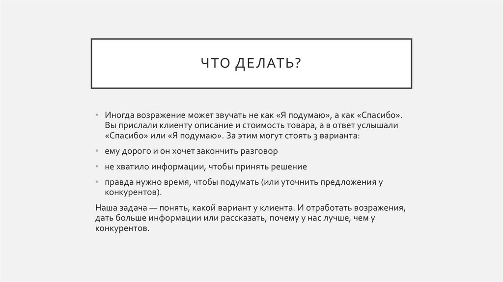 ЧТО ДЕЛАТЬ?• Иногда возражение может звучать не как «Я подумаю», а как «Спасибо».