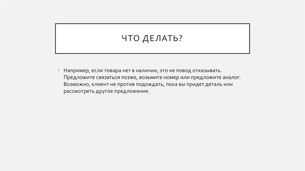 ЧТО ДЕЛАТЬ?• Например, если товара нет в наличии, это не повод отказывать.