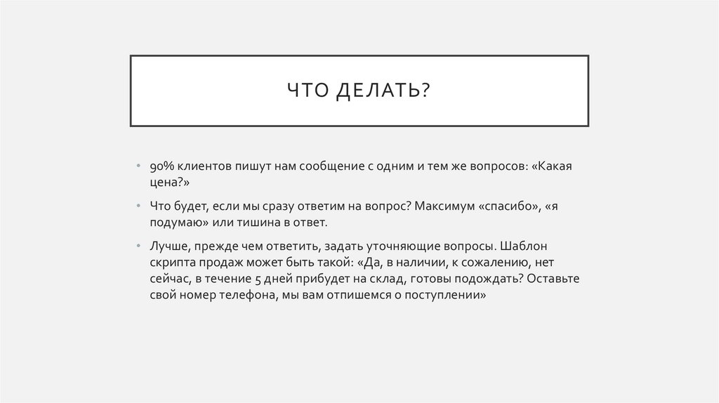 ЧТО ДЕЛАТЬ?• 90% клиентов пишут нам сообщение с одним и тем же вопросов: «Какая