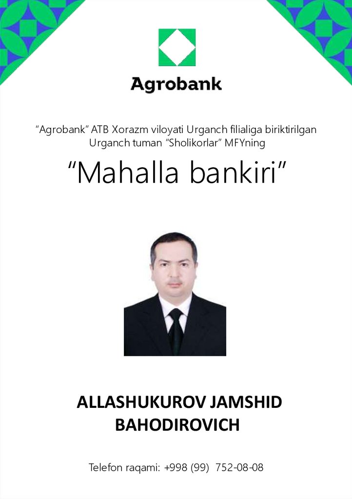 “Agrobank” ATB Xorazm viloyati Urganch filialiga biriktirilgan