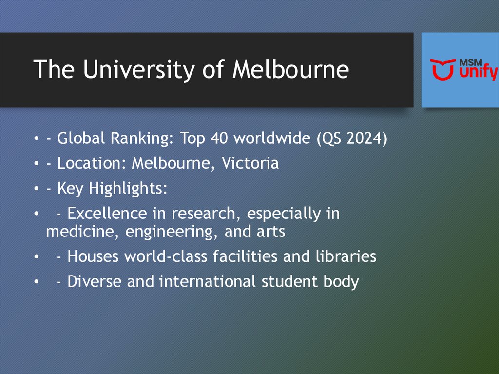The University of Melbourne• - Global Ranking: Top 40 worldwide (QS 2024)