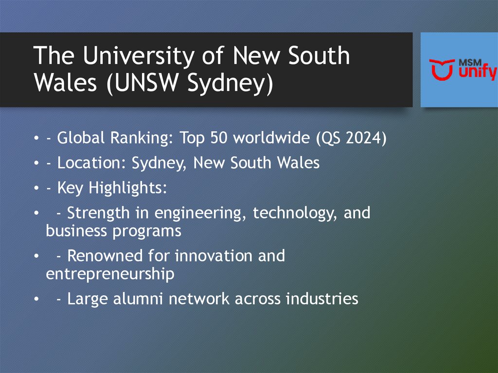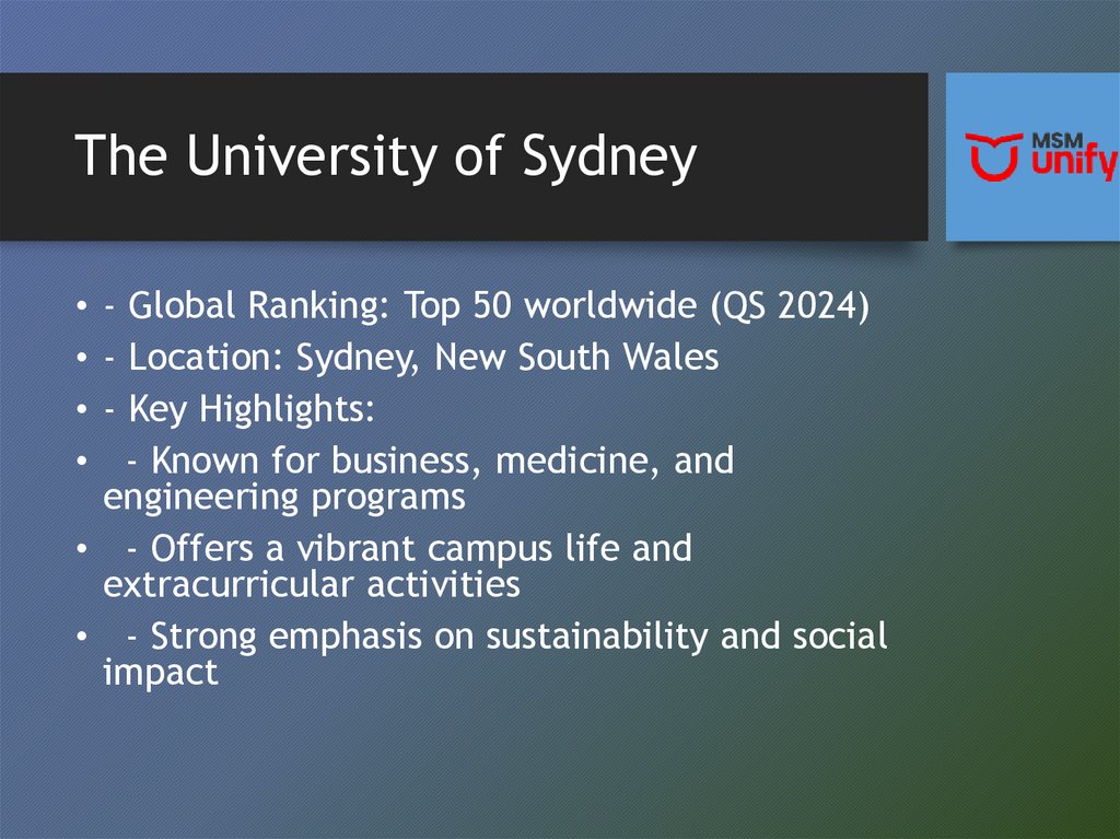 The University of Sydney• - Global Ranking: Top 50 worldwide (QS 2024)