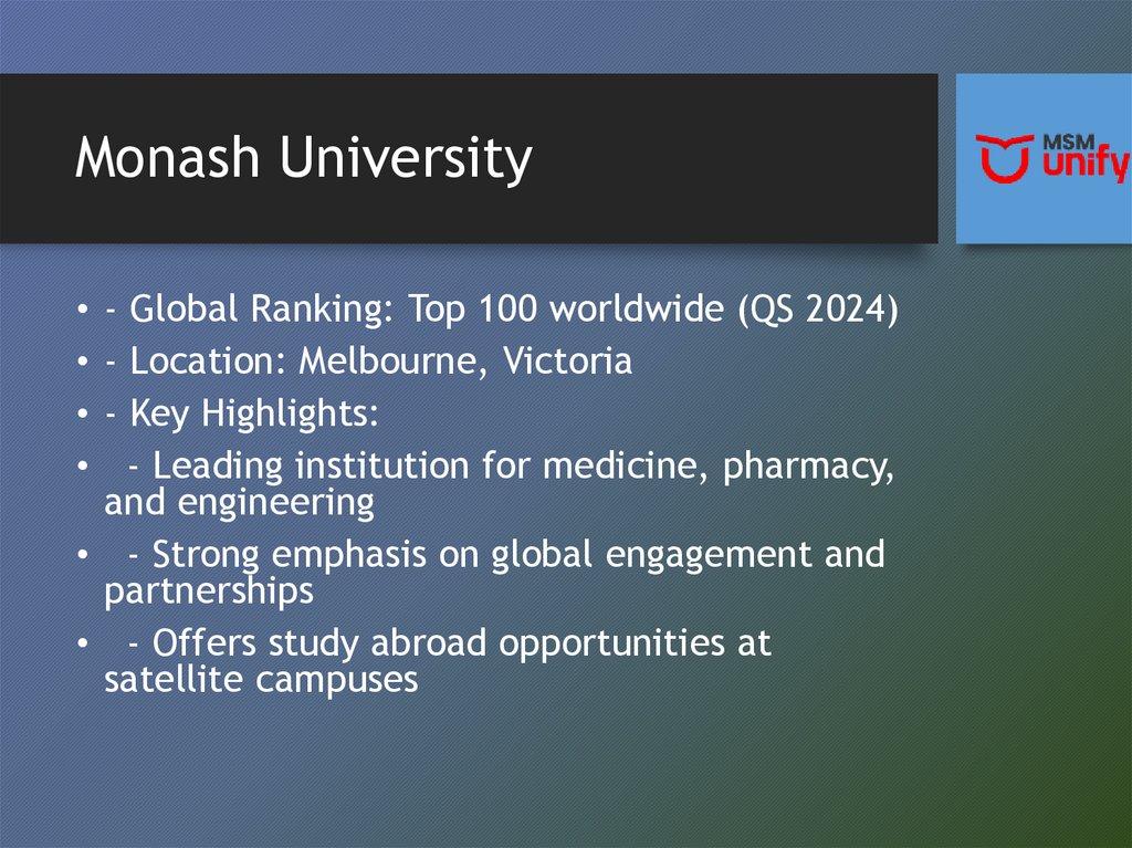 Monash University• - Global Ranking: Top 100 worldwide (QS 2024)